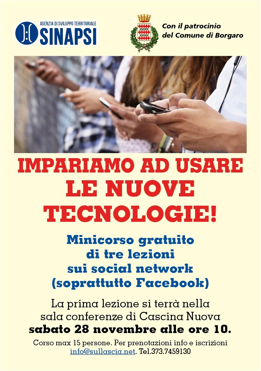L’associazione Sinapsi organizza corsi gratuiti per i borgaresi per mostrare a chi non ne fosse ancora a conoscenza come si utilizza Facebook (il social network più utilizzato in Italia) in modo ottimale e senza incappare in rischi indesiderati (purtroppo molto comuni e poco conosciuti).