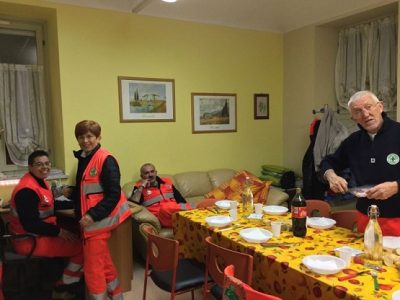E puntuali alle venti, eravamo anche noi all’appuntamento che ci era stato prefissato per respirare (nuovamente e con nostalgia) un po’ di “aria verde“. La piacevole cena, a cui siamo stati graditi ospiti, è un momento al quale la sesta non manca mai dovendo appunto rispettare – rigorosamente – l’orario di inizio turno: le venti appunto. Così i nostri militi e militesse – Beppe, imprenditore ingegnere, Guido, pensionato, Fulvia, da poco pensionata ma gli amici ci dicono che “lavora a tempo pieno in tutte le associazioni di volontariato borgaresi, Erika, commessa e giovane mamma di due bimbi, Mauro, operatore socio assistenziale presso un ospedale torinese, ed infine Ellis, libero professionista – sono serenamente e affabilmente seduti al tavolo della sala militi. Ma all’appello mancano ancora Elisa, medico chirurgo vascolare , in servizio per lavoro e ampiamente giustificata per l’assenza , e Riccardo, all’estero per impegni personali. Dunque otto militi effettivi, che garantiscono sempre la copertura di almeno due equipaggi per turno, suddivisi su due unità da tre/quattro militi. Infatti, appena seduti a tavola, il telefono del 118 chiede l’urgenza di una ambulanza all’aeroporto Sandro Pertini: un passeggero in partenza necessita di ricovero ospedaliero urgente. Guido ,Erika e Mauro sono i tre militi addetti al servizio: l’ambulanza è già pronta, i bulbi blu accesi, l’autista alla guida chiede l’ok alla partenza al milite sul retro ambulanza, il tempo di uno scatto fotografico per il giornale e il mezzo svanisce lasciando dietro di se il colore azzurro dei diffusori luminosi che si fondono nell’acquerugiola della fresca notte di inizio inverno. I rimanenti militi proseguono nella sobria cena, ma… non vediamo più rientrare l’equipaggio. A volte i tempi di un servizio sono anche molto lunghi ed al termine, già vi è in coda ed in attesa , magari meno urgente, un altro intervento. Al nostro equipaggio mancherà sicuramente una fetta di quella meravigliosa torta margherita appena sfornata e sicuramente voluta per onorare la presenza di questo ospite.