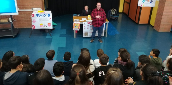 A colloquiare, in mattinata con gli alunni delle classi 1e e 2e della Scuola Secondaria di Primo Grado dell’Istituto Comprensivo di Borgaro e nel tardo pomeriggio con i loro genitori, è stato Fabio De Nunzio, conduttore televisivo e radiofonico, nonché autore del libro “Sotto il Segno della Bilancia News”. Un volume che descrive un importante percorso emozionale, dove emergono i dissidi interiori, le insicurezze, gli interrogativi e le complesse e fragili sensibilità di chi si sente diverso, discriminato o bullizzato e che, oltre a ben cinque riconoscimenti, ha anche permesso a De Nunzio di essere insignito del titolo di Cavaliere per la Pace di Assisi. “Un libro che si pone l’obiettivo di tendere la mano a chi sta indietro, perché spesso ci si dimentica di aiutare” ha commentato De Nunzio, che soprattutto con i ragazzi ha sottolineato l’importanza di non chiudersi in caso di episodi di bullismo, ma anzi segnalarli a genitori e insegnanti. Nel corso della lunga mattinata, De Nunzio ha chiesto agli alunni di aprirsi con lui, raccontando le proprie esperienze personali. In alcuni casi bulli e bullizzati sono stati messi a confronto e invitati a chiarirsi anche attraverso un abbraccio collettivo.