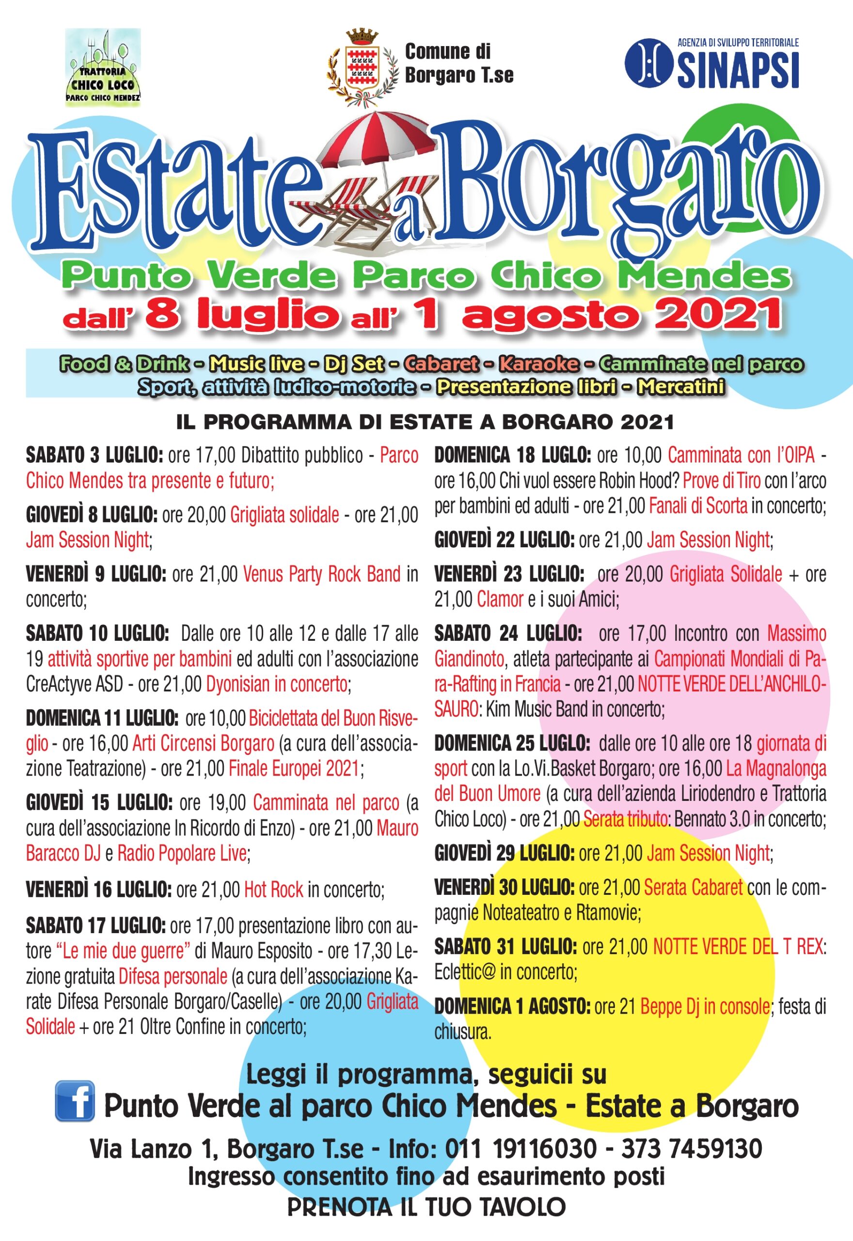 La manifestazione, promossa dal Comune di Borgaro in collaborazione con l’associazione Sinapsi e il ristobar Chico Loco, prende il via oggi, 9 luglio e andrà avanti fino all’1 agosto 2021. Dal giovedì alla domenica, in programma tanta roba e per tutti i gusti, con ben 12 concerti di musica dal vivo, 2 serate dj set, una di teatro-cabaret. (leggi e/o scarica il programma completo). Ogni serata prevede aperitivi, apericene e menù a tema, ma anche le Grigliate Solidali (il 17 e il 23 luglio) dove parte degli introiti saranno devoluti al Nucleo di Protezione Civile dei Bersaglieri, sezione di Borgaro, per l’acquisto di un mezzo di servizio.
