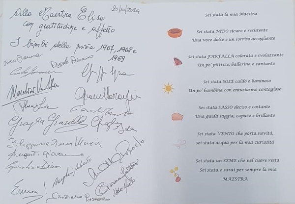 Plesso che, nella mattinata del 20 ottobre, l’attuale Dirigente Scolastica Lucrezia Russo, ha aperto agli ex alunni e alla maestra Elisa Donadonibus – oggi 86enne – arrivata da Udine proprio per incontrarsi con i “suoi bambini”, di cui ricorda ancora vividamente le caratteristiche e i nomi. Rivedendo anche i registri dell’epoca, che Russo ha ricercato nell’archivio scolastico e che hanno permesso di rifare l’appello, tra l’emozione della maestra Elisa e dei presenti.