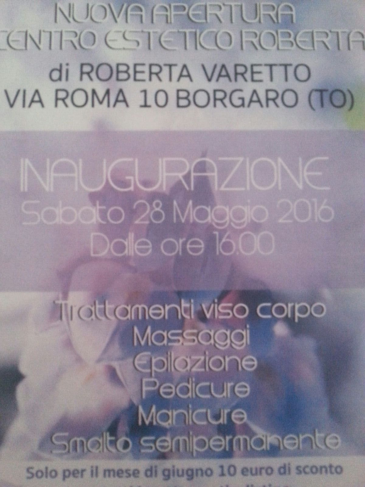 Nella giornata di sabato 28 maggio, a partire dalle ore 16.00, la giovane borgarese Roberta Varetto inaugurerà il “Centro Estetico Roberta”, in Via Roma 10, a Borgaro Torinese.