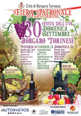 Borgaro – Una Fiera che vuole superare il successo ottenuto l’anno scorso . E’ questo l’obiettivo che l’amministrazione comunale di Borgaro, l’associazione Sinapsi e l’Agenzia Street Events si sono posti per il prossimo 30 settembre, giornata in cui si svolgerà la Fiera d’Autunno dedicata ai Santi patroni Cosma e Damiano. “Questa edizione avrà come tema centrale l’uva e il suo prodotto di eccellenza, il vino, – dichiara Fabrizio Chiancone, assessore al Commercio della città – con alcuni spazi di degustazione dislocati in via Costituente, grazie alla presenza di cantine e produttori del Piemonte. Inoltre, durante la giornata saranno distribuiti gratuitamente a tutti i presenti 5 quintali di uva”.