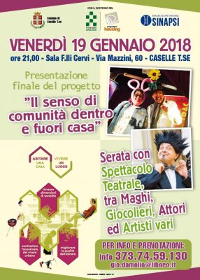 Caselle/Mappano – Un condominio tranquillo in un paese tranquillo con condomini tranquilli, ma….un giorno tutto cambia… Basta una situazione, una parola per creare suggestioni esilaranti e tragicomiche. La vita vissuta tra i balconi…, le scale, le aree comuni, lo scambio di opinioni sulle persone che abitano il caseggiato…, trovarsi per caso a buttare il sacchetto dell’immondizia… Inizia così lo spettacolo teatrale “Casini in condominio!”, in scena venerdì 19 gennaio 2018 a Caselle, ore 21 Sala Fratelli Cervi, via Mazzini 60, che farà da filo conduttore alla serata promossa dall’associazione Sinapsi per presentare i risultati del progetto sperimentale “Il senso di comunità dentro e fuori casa” sostenuto dalla Compagnia di San Paolo – Programma Housing – nell’ambito del bando “Abitare una casa, vivere un luogo”, con il cofinanziamento anche del Comune di Caselle, del Consorzio CIM di Mappano e di Sinapsi stessa.