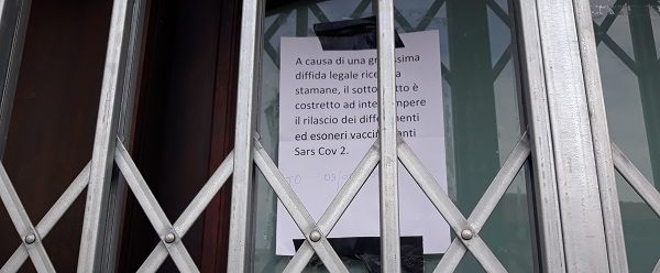 Sono quasi quotidiani gli interventi dei Carabinieri che controllano le generalità delle molte persone che si assiepano nella strada. E da giovedì è comparso sulla porta d'ingresso della struttura del medico un foglio, non firmato, che riporta la frase che è interrotto “il rilascio dei differimenti ed esoneri vaccinali anti Sars Cov 2”.